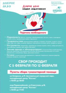Сегодня в рамках акции #ДоброеДело в молодежном центре «Космос» стартует сбор гуманитарной помощи для военнослужащих, находящихся в зоне СВО