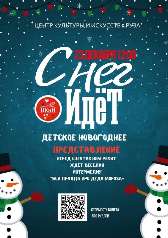Центр культуры и искусств Рузы приглашает вас на волшебное новогоднее представление. 23 декабря в 12:00 состоится удивительный спектакль «Снег идет». Что случается с непослушными детьми? В сказке они могут превратится даже в Снеговиков, что и произошло с нашими героями. Смогут ли они договорится с солнышком, чтобы то не появлялось и не растопило их? Чем закончилось необычное приключение? Об этом и многом другом, вы узнаете в премьерном праздничном выступлении.